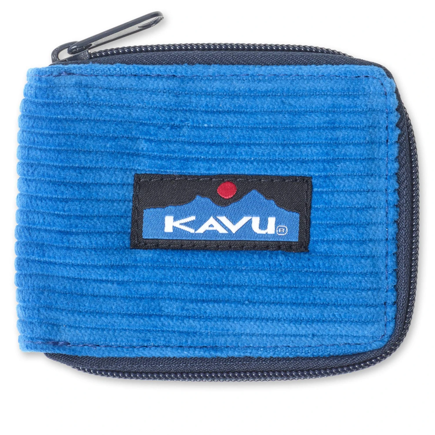 Das kleine Portmonee für Reise und Alltag besteht aus robustem, breit gestreiften Baumwollcord. Die Farben sind herrlich leuchtend und auf der Front ist das Kavu-Berglogo aufgenäht.