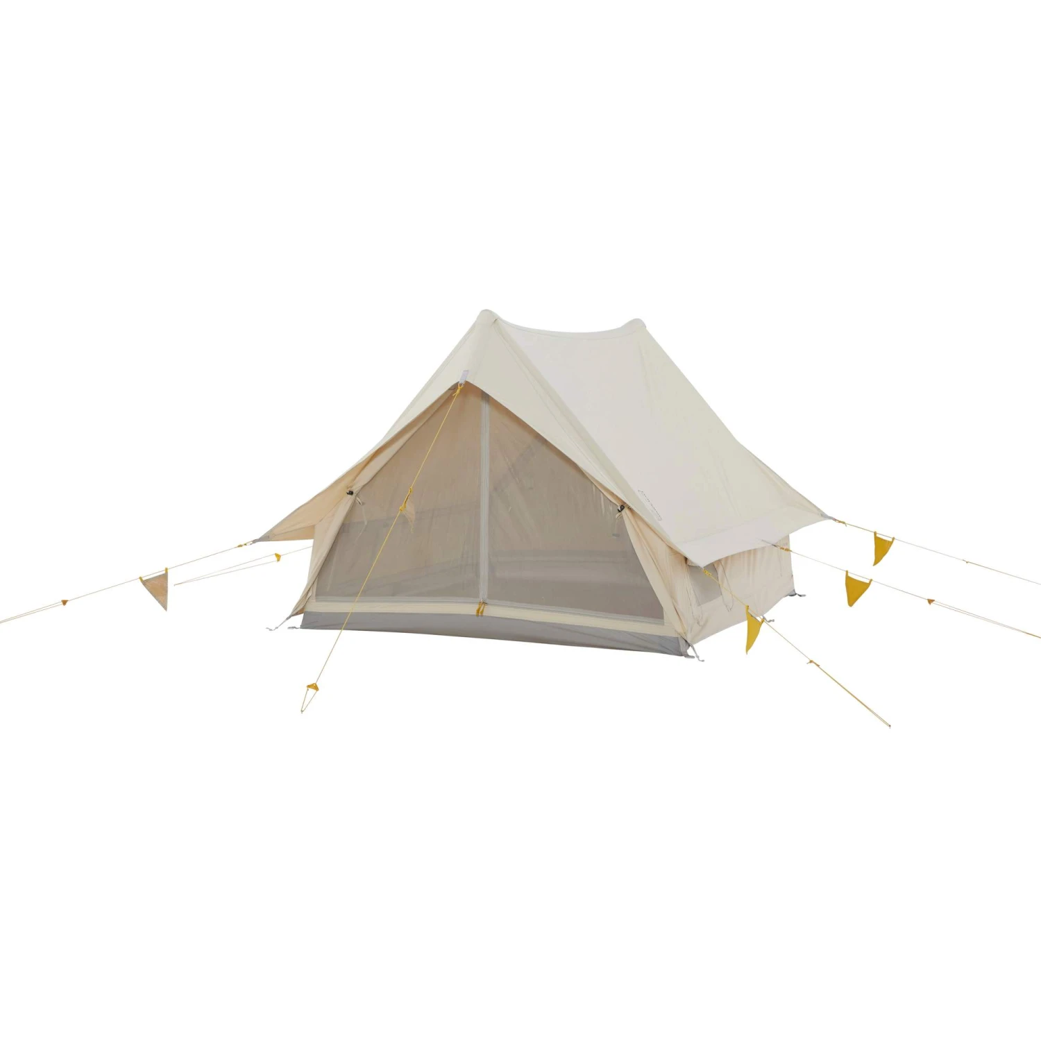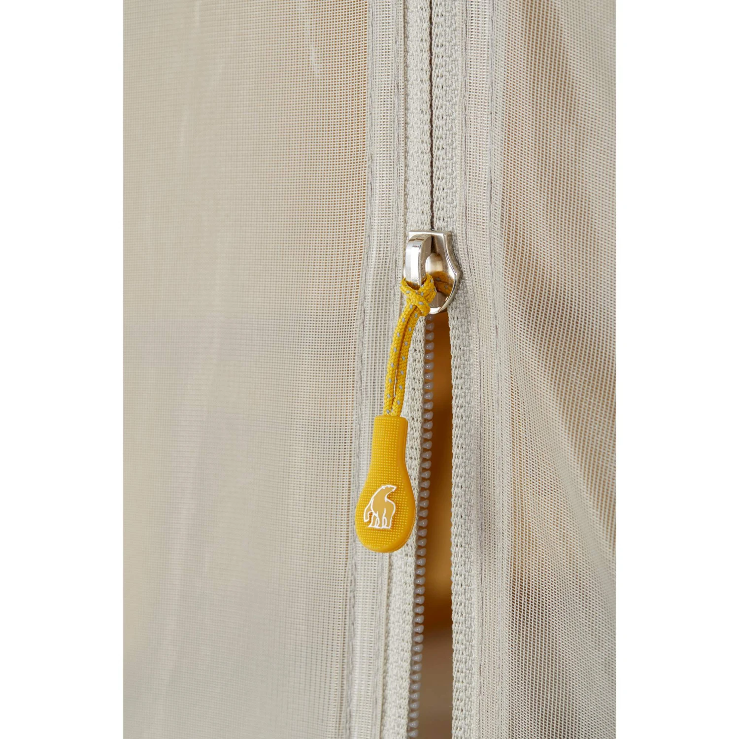 Die seitlichen Wände bestehen aus temperaturregulierendem Polyester-Baumwoll-Mischgewebe. Sie sind wasserdicht und dennoch atmungsaktiv, wodurch es sich auch im Sommer gut im Zelt aushalten lässt. Für noch mehr Frischluft kannst du die seitlichen Ventilationsöffnungen zur Belüftung öffnen. Das Moskitonetz verhindert dabei, dass ungebetene Gäste ins Zelt gelangen.