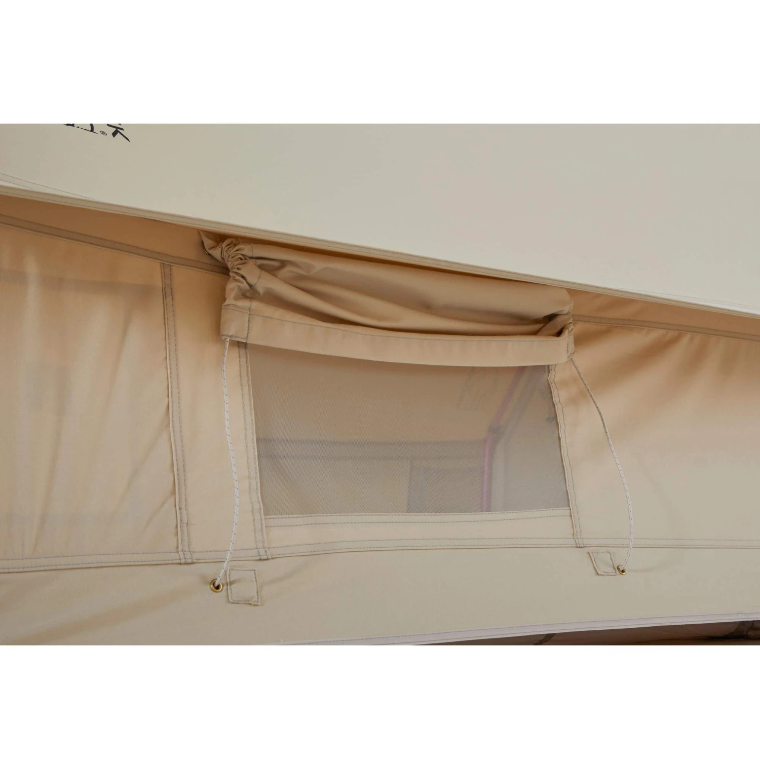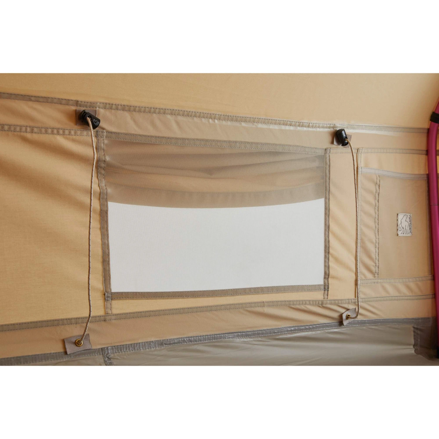 - Zelttüren können aufgerollt mit einem Knebelverschluss befestigt werden