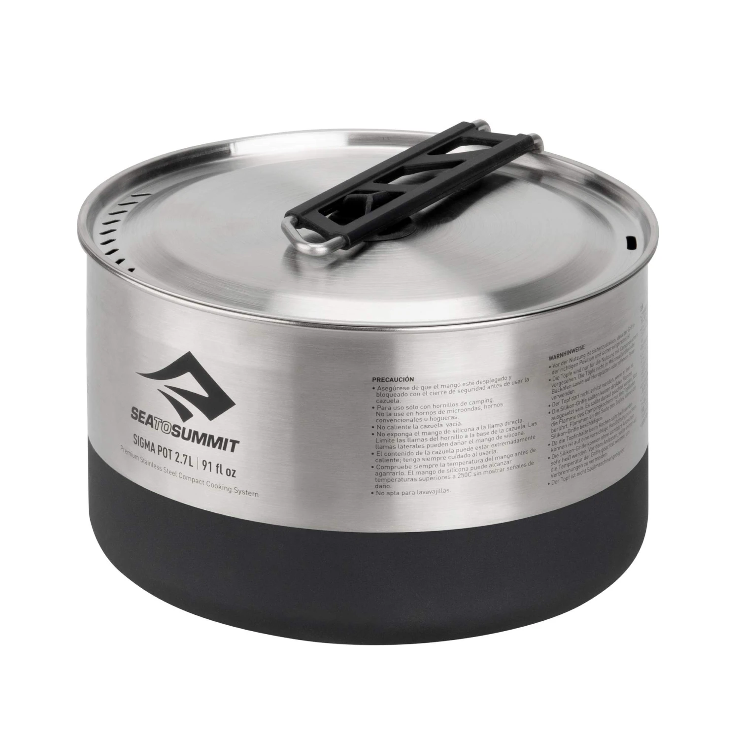 Klassische Edelstahltöpfe sind häufig sehr schwer und damit für Outdoortouren ungeeignet, bei denen du das Gepäck mit eigener Muskelkraft transportieren musst. Die Sigma-Serie schafft Abhilfe. Das dünnwandige und dennoch robuste Material nimmt nicht mehr Platz ein als nötig. Der isolierte Griff kann zum Transport über den Topf geschwenkt werden und fixiert dort den Deckel. Für die Benutzung rastet der Griff durch den Pivot-Lock fest ein.
