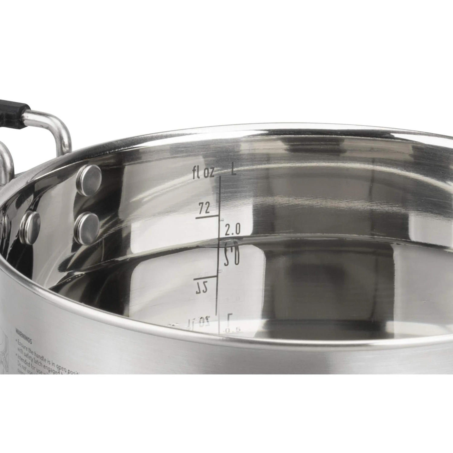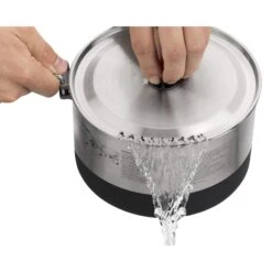 Der Topfrand ist abgekantet, was dir ein kleckerfreies Ausschenken ermöglicht. Um nur so viel Wasser zu erhitzen, wie du tatsächlich benötigst, hilft dir eine Volumenskala auf der Topfinnenseite. Für einen sicheren Stand sorgt die schwarze Thermal-Beschichtung am Topfboden. Sie ist rutschfest und leitet die Hitze über die gesamte Bodenfläche.