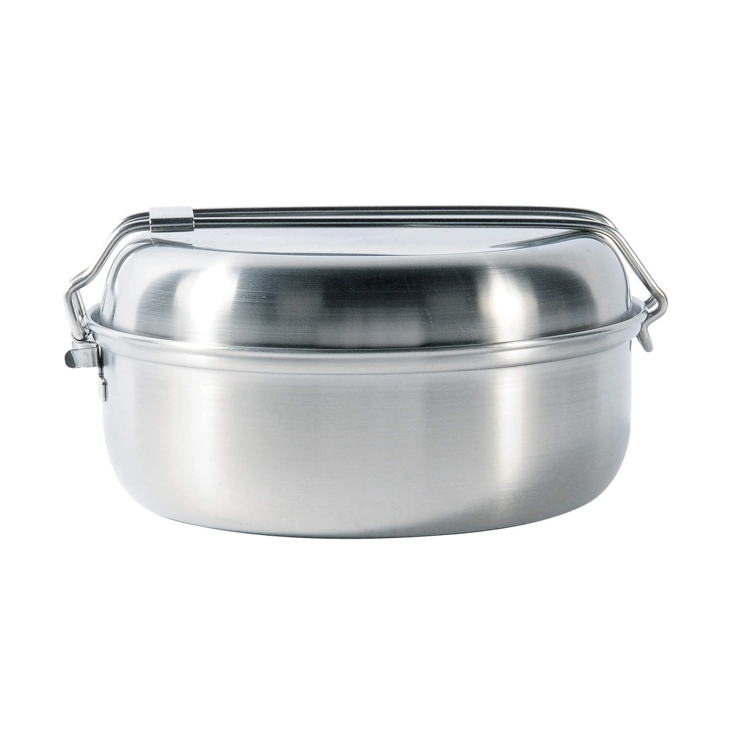 Kleines Geschirrset für eine Person, bestehend aus 0,8 l Topf mit Deckel, Schale und einer Pfanne mit hohem Rand. Alle Teile sind ineinander stapelbar und nehmen damit wenig Platz im Gepäck ein.